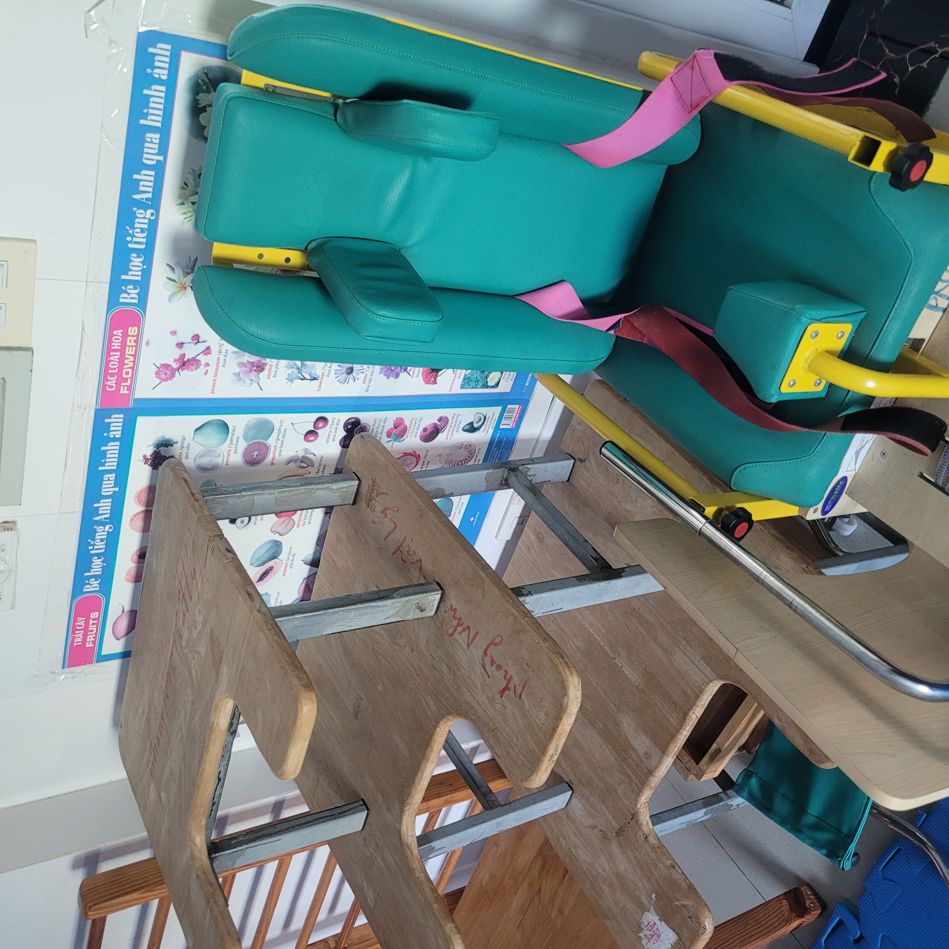 OTテーブル+椅子、訓練自転車、手首・指用の訓練器機、木製梯子、超音波治療器、筋肉刺激装置、脊椎牽引機