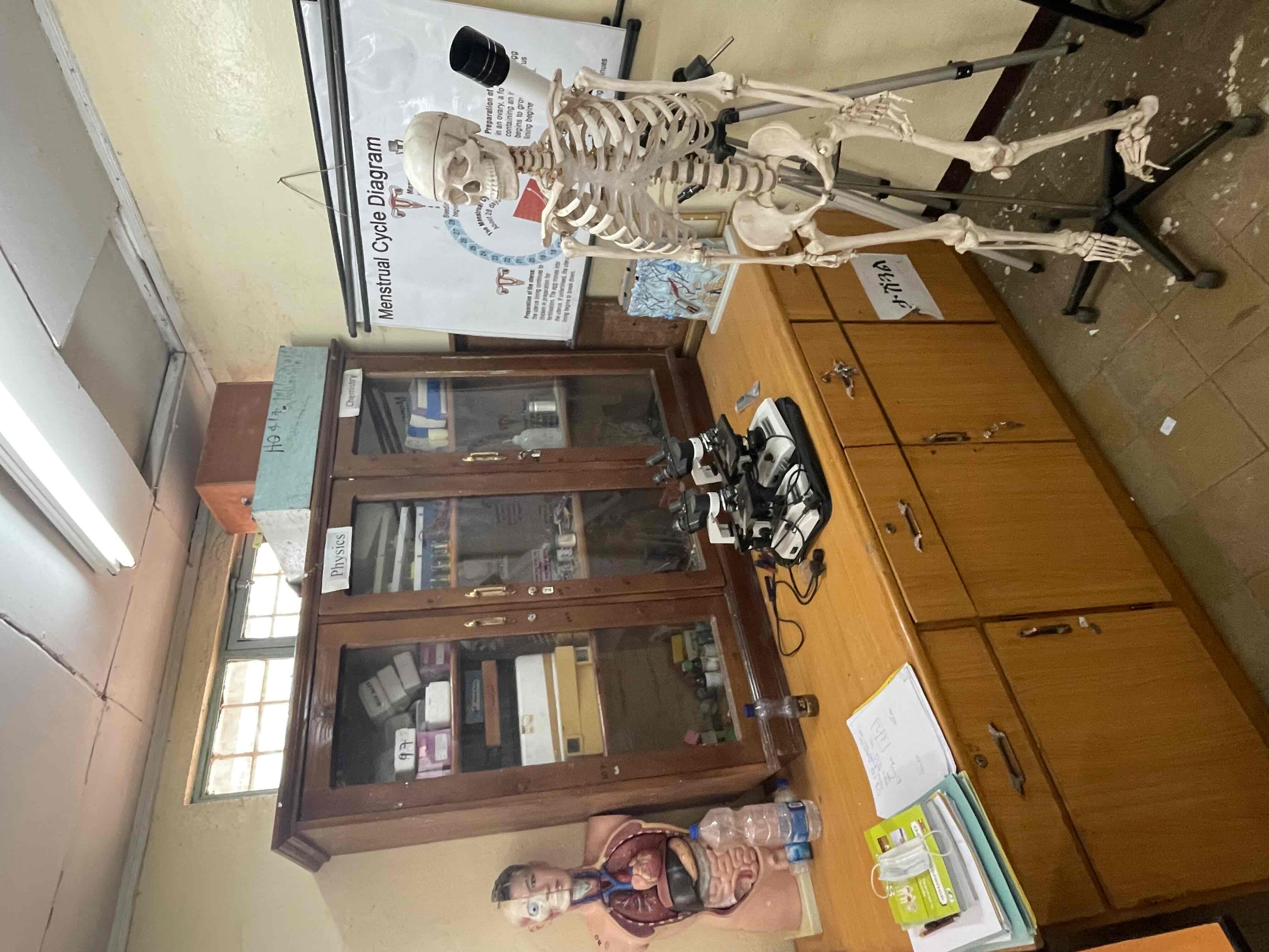 理科実験室、薬品、器具:試験管、フラスコ、ビーカー、顕微鏡(数は少ない)、人体模型など